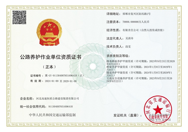 河北高速恒質(zhì)公路建設(shè)集團(tuán)有限公司始建于2004年,前身是邯鄲市恒質(zhì)公路建設(shè)集團(tuán)有限公司。2024年7月成為河北高速公路集團(tuán)有限公司二級(jí)子公司,現(xiàn)有職工500余人,下轄18家子公司13個(gè)分公司,參股公司3家 ,注冊(cè)資本7億元,是一家集公路工程施工、路用材料研發(fā)生產(chǎn)、試驗(yàn)檢測(cè)、瀝青貿(mào)易、公鐵物流于一體的多元化、綜合性單位,國(guó)家級(jí)高新技術(shù)企業(yè),河北省專精特新中小企業(yè),河北省首家瀝青拌合環(huán)保引領(lǐng)性企業(yè)。公司擁有公路工程總承包壹級(jí)、公路交通工程(公路安全設(shè)施)專業(yè)承包壹級(jí)、機(jī)電工程施工總承包貳級(jí)、電力工程施工總承包貳級(jí)、市政公用工程施工總承包貳級(jí)、建筑工...